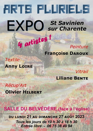 Arts Pluriels Saint Savinien, du 21 au 27 aout 2023Salle du Belvédère Françoise Daroux, Anny Loire, Liliane Bente et Olivier Hilbert |